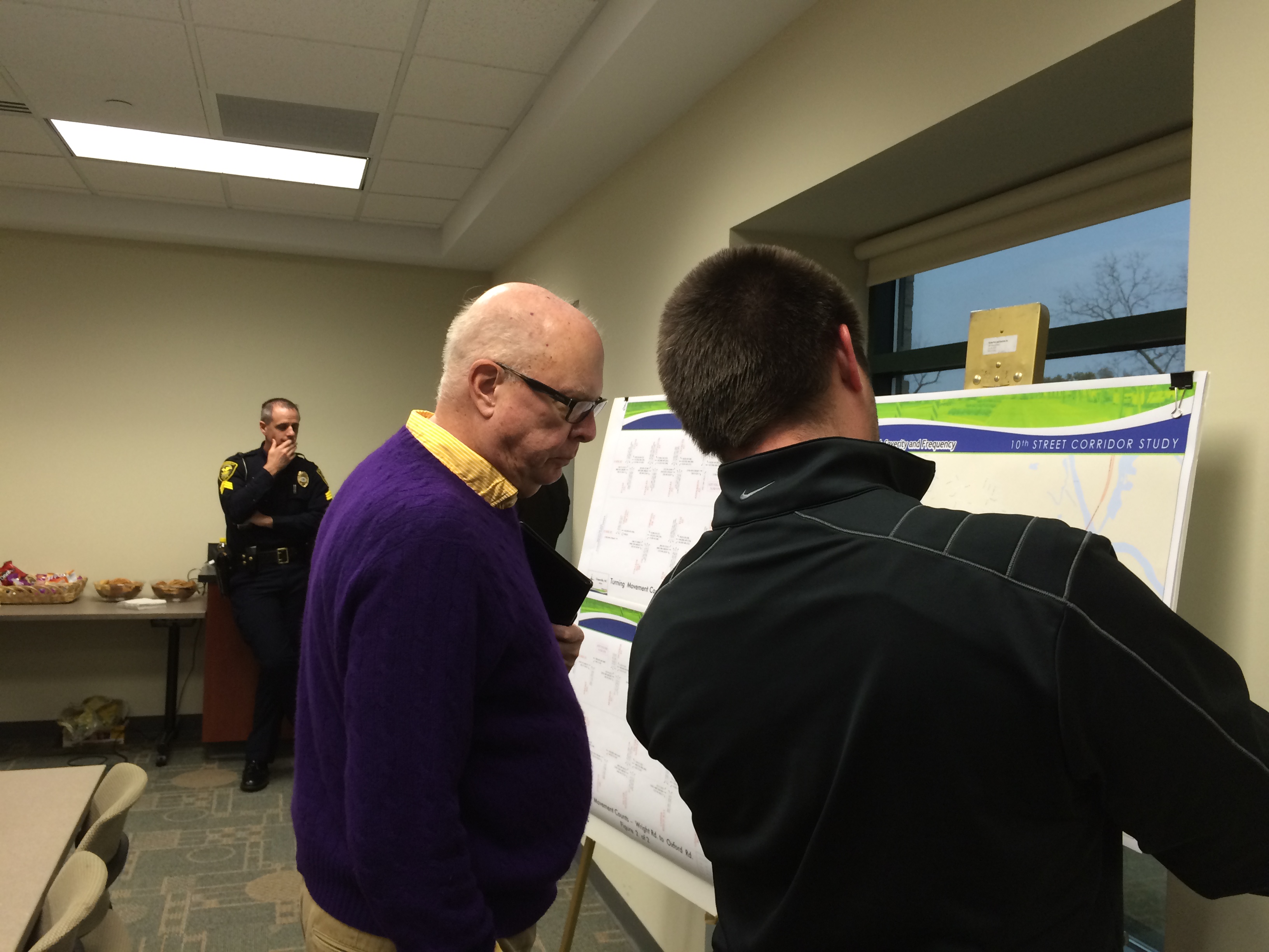 March 5, 2015: Today's Greenville Reflector (See http://www.reflector.com/news/10th-street-corridor-discussion-set-tonight-2808795 ) invited citizens to view maps of the Tenth Street Corridor and suggest improvements for this future project. Attendees were observed suggesting sidewalks, bikelanes, crosswalks, and pedestrian crossing buttons.